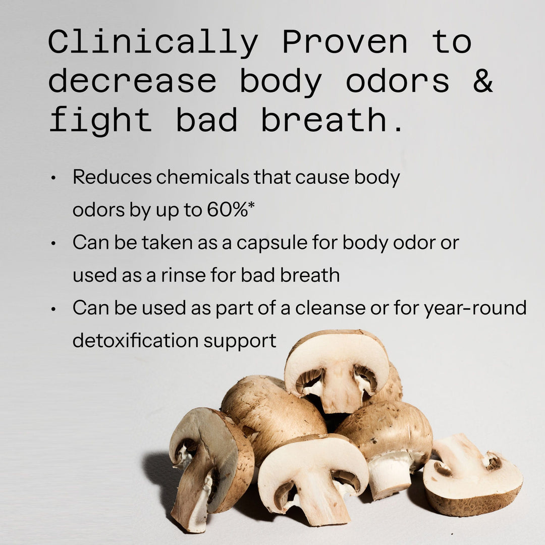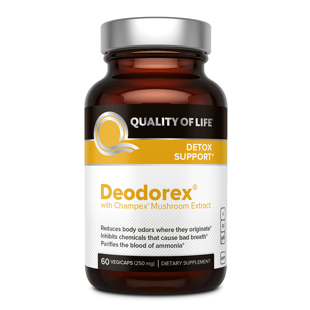 Deodorex® features Champex® Mushroom Extract, a patented, proprietary concentrated extract of champignon mushroom. In human clinical research, Champex® has been shown to decrease body odors, fight bad breath, purify the blood of ammonia and uric acid, and promote kidney health.*